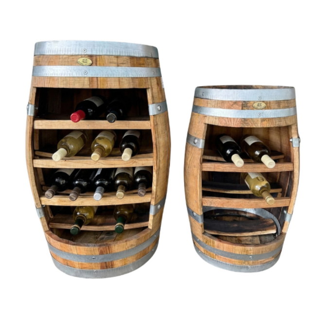 Onze wijnkasten zijn verkrijgbaar in twee formaten – 60 liter en 110 liter – en worden gemaakt van de originele duigen van het vat. De liggers zijn zorgvuldig verwerkt uit massief hout, wat zorgt voor een robuuste uitstraling en duurzame kwaliteit. Geen fineer, geen compromissen, alleen puur vakwerk.